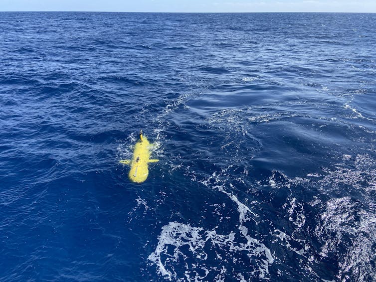 Le sous-marin autonome IdefX plonge vers la zone d’étude. Benoît Ildefonse, Campagne Arc en SubFourni par l’auteur