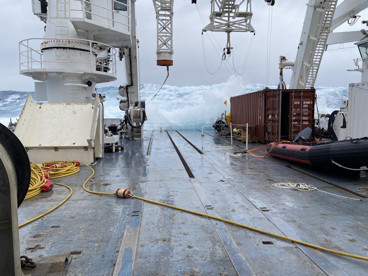 Les opérations sont à la merci des conditions météorologiques. Une tempête interrompt les plongées lors de la première semaine de l’expédition. Benoît Ildefonse, Campagne Arc en SubFourni par l’auteur