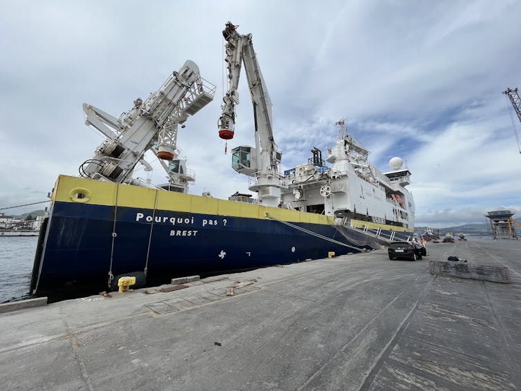 Le navire Pourquoi Pas ? est amarré au port avant le départ. Les grues sur le pont arrière permettent de mettre à l’eau et de récupérer les engins d’explorations : sous-marins et robot télécommandé. Alexandre Schubnel, Campagne Arc en SubFourni par l’auteur