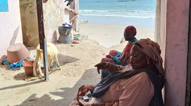 Fatou Samba nous accueille dans son ancienne maison, rongée par la montée de l’océan. Une partie de l’habitation a encore récemment été détruite, malgré les pneus et les sacs de sable entassés en contrebas pour tenter de faire barrage aux vagues.